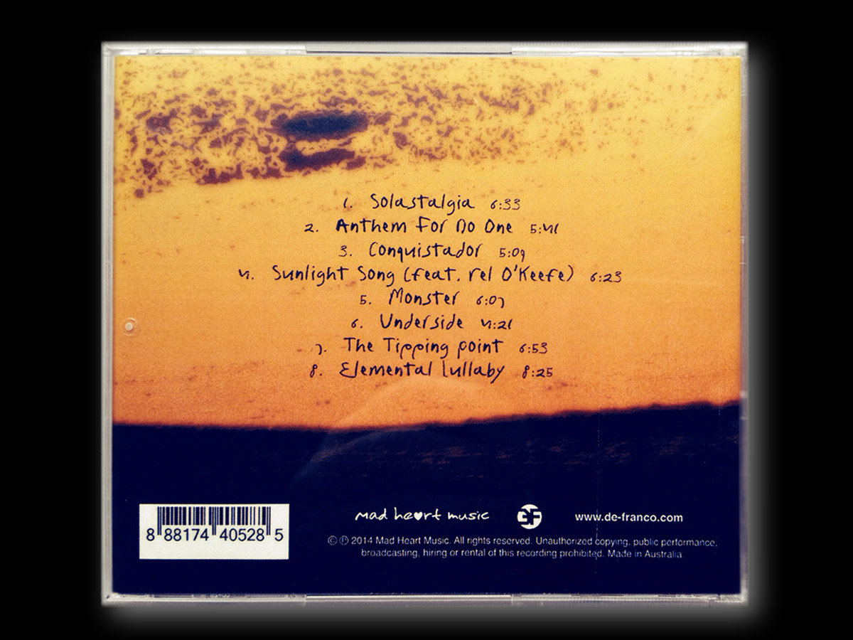 De-Franco explains: “The album title came about from reading a New York Times article about Professor Glenn Albrecht and a philosophical term he’d coined, Solastalgia, in response to mining activities in the Hunter Valley in Australia. And whilst not an environmental album per se, I certainly wanted to explore a range of emotions in relation to aspects of that pain he described, that loss, that feeling of helplessness.”